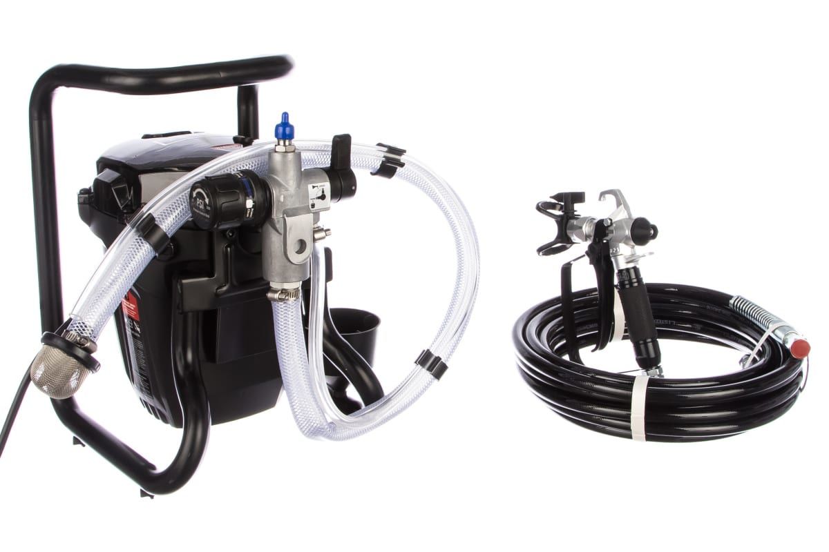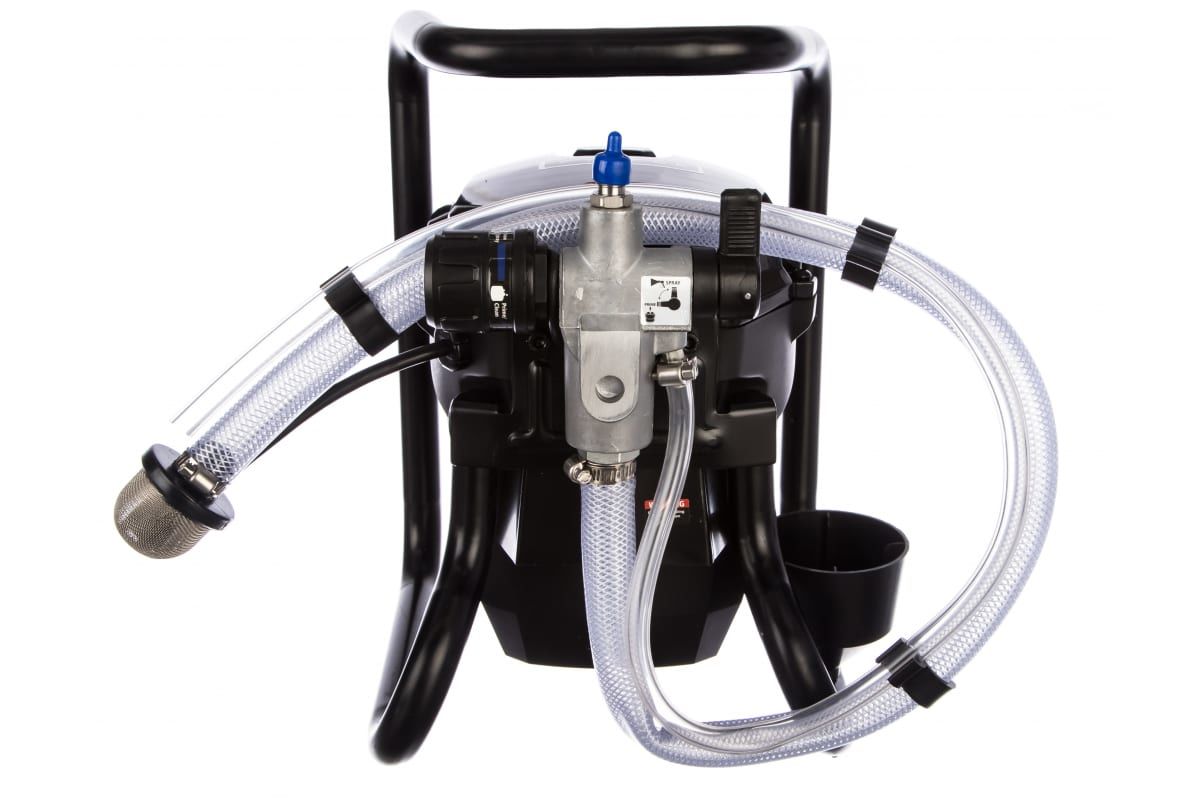 В комплектацию окрасочного аппарата, кроме самого аппарата, входят краскораспылитель, шланг для распыления, всасывающий шланг с фильтром, сопло, инструкция и упаковка. Окрасочный аппарат всасывает краску из ведра и подает ее для распыления по шлангу.